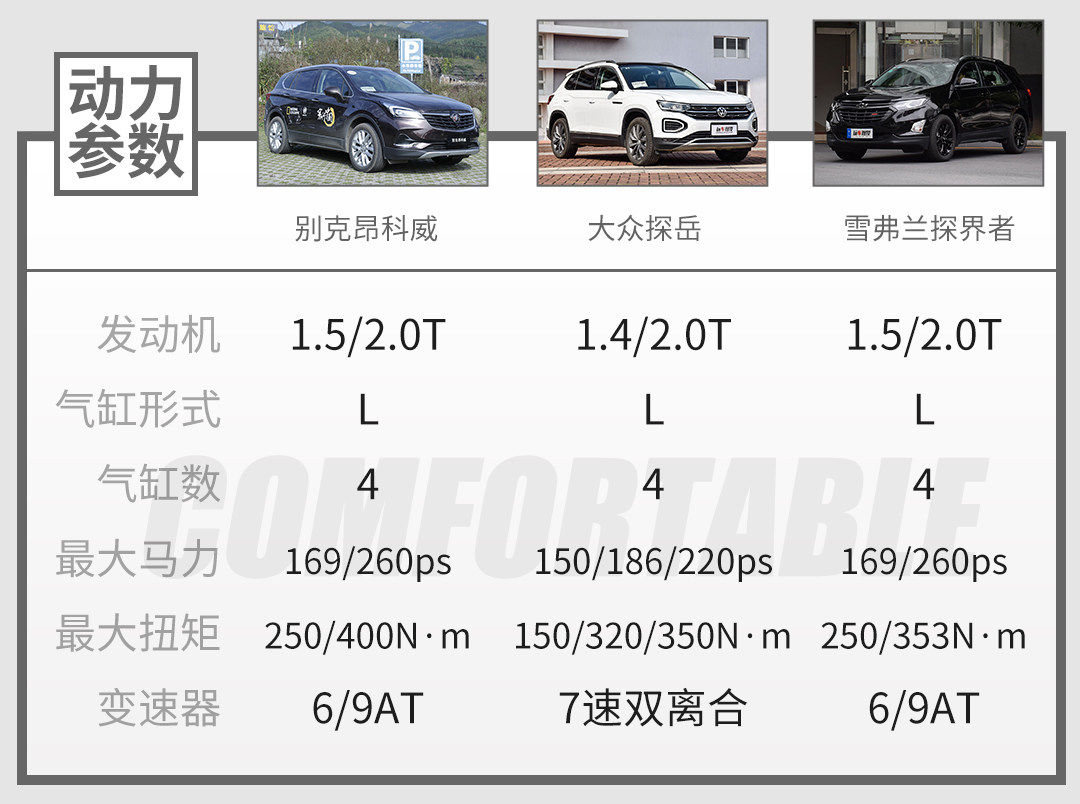 昂科威搭载了1.5T跟2.0T两款直喷涡轮增压发动机,最大功率分别为124/191kW,峰值扭矩分别为250/400N·m;1.5T版匹配了7速DCG PLUS变速箱,而2.0T版则匹配了9速HYDRA-MATIC变速箱。