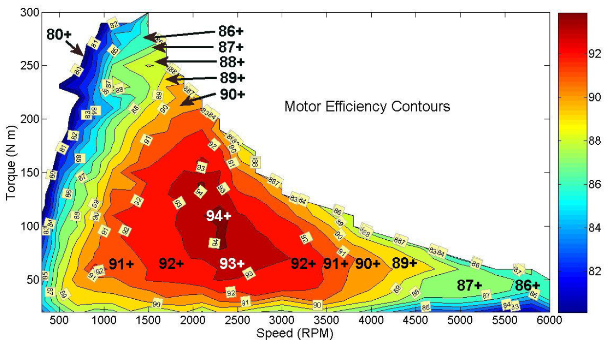 一台普通的三相交流电机,最高效率做到92%没有任何问题,如果针对性的优化,效率提升到94%也行!但电机和汽油机一样,不同转速和扭矩区间下,效率会有变化,但不管怎么变,电机最低效率几乎都在80%左右。