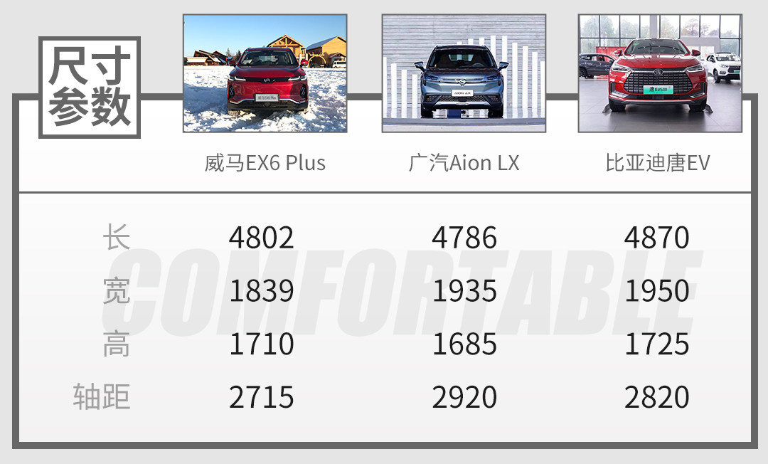 新车长宽高:4802/1839/1710mm,轴距2715mm,尺寸数据在同级车比亚迪唐EV、广汽新能源Aion LX等面前并不占优势,不过新车空间能力并不输于它们当中的任何一方。