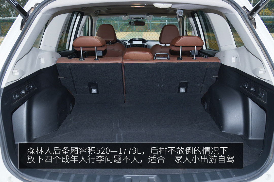 森林人载物性能更强,放倒后排的后备厢最大容积可达1779L,可以放下4个人的行李,行李箱+背包,可以满足一家人的出游;而傲虎的常规容积为521L,放倒后排后可扩充至1801L,跟森林人差不多。