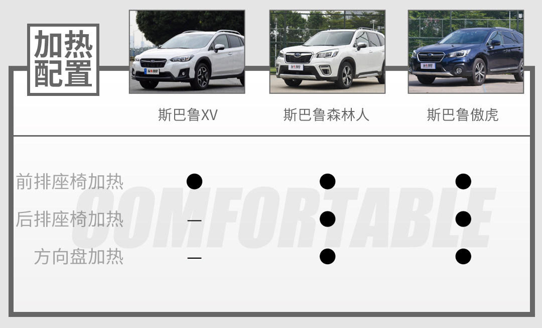 上文提到,斯巴鲁XV的越野表现要优于森林人和力狮,而穿越的功能性,自然是定位更高的森林人和力狮更有优势。首先体现在加热配置上,森林人和傲虎都配备有前排&后排座椅加热,还有方向盘加热,能保证四位乘员的温暖,而XV只有前排座椅加热。