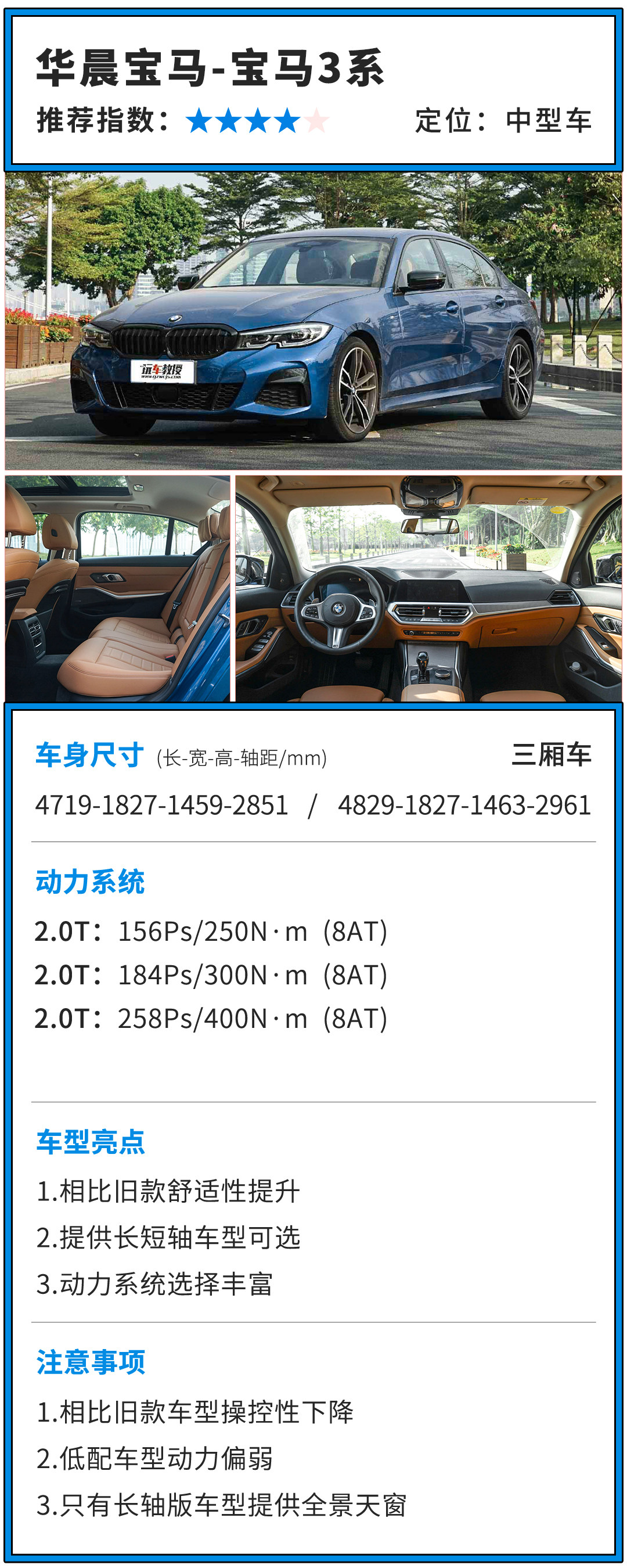 内饰上新款3系变得比以前更有科技感了,全新样式的换挡杆为车内提升了不少高级感,在长轴版车型上还提供了全景天窗,也算是多方面满足国人的用车需求了。但是在动力上,新3系就显得有点“鸡贼”了,入门款车型得2.0T竟然只有156马力,这可是跟E90时代的自吸320一样的动力,而且售价相比起325车型差距并不大,建议还是选择325的车型吧。