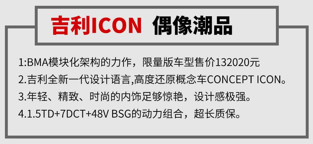 在动力方面,基于BMA基础架构开发的吉利ICON采用了1.5TD+7DCT+48V BSG动力组合,即1.5T的发动机+7DCT变速箱+48V电机,这款发动机是与沃尔沃联合研发打造的缸内直喷涡轮增压发动机,在48V电机的辅助下,整车综合最大功率达140kW,综合最大扭矩300N·m,百公里加速仅需7.9秒。