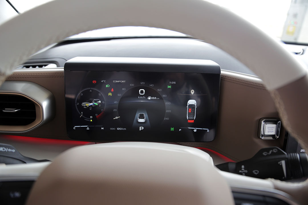 10.25英寸的仪表看上去精致时尚,以黑色为底实现了无边框的效果,同时进行了防眩目的处理,在UI画面上也是设计得简洁美观。只不过从实际的观感来看也存在着一些不足,例如整体的尺寸偏小,位置偏低,方向盘的中间位置会在一定程度上挡住仪表盘的最下面部分,从而影响到驾驶员对于仪表数据的观察。