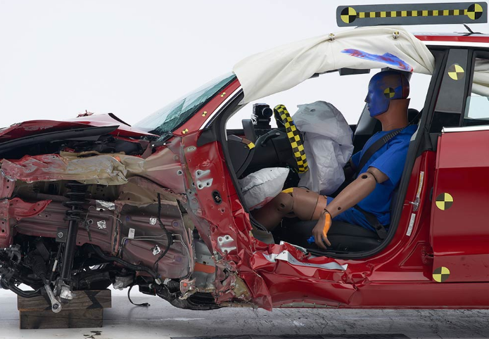 电动车跟燃油车不同,电池组不但重而且体积大,尺寸差不多的燃油车,整备质量只有1.4吨左右,但小鹏G3却有1.6吨。车越重车身所承受的撞击能量就越大,于是对车身的要求也相应提高,好在G3的车身安全性并没有让人失望,前立柱上下铰链的侵入都很小,A柱也没有发生明显变形。对比过特斯拉Model 3测试成绩,你会发现小鹏G3车身安全性并不逊色。
