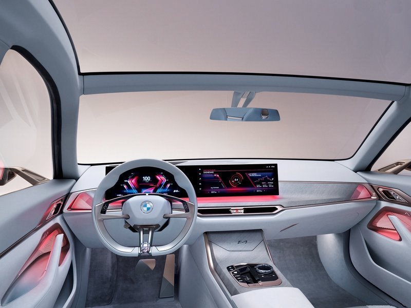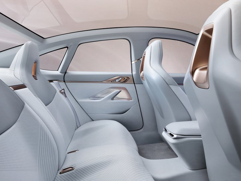 触屏采用无反射玻璃材质制成,确保驾驶员在强烈的外界光线下也能清晰地看到屏幕信息。喜欢轿跑车型的司机们,肯定也会爱上这种未来感十足的数字化座舱设计。i4概念车的座椅材质由超细纤维和橄榄叶鞣制的天然皮革材料组成,体现了一款新能源车型应有的环保可持续设计理念。大面积浅色内饰和磨砂亮铜色车身,足以看出设计师打造这款车型内饰时在配色上的讲究。
