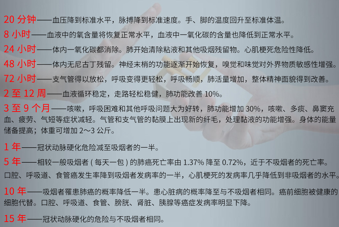 不抽烟的第二十年,阿宅看着银行卡里多出的12万元,开始为当初戒烟的决定感到高兴,当然除了钱多了,还有身体更好了。科学研究发现,抽烟者一旦开始戒烟后,身体立马就会得到丰厚的回报。不信的话,我们先看一组数据: