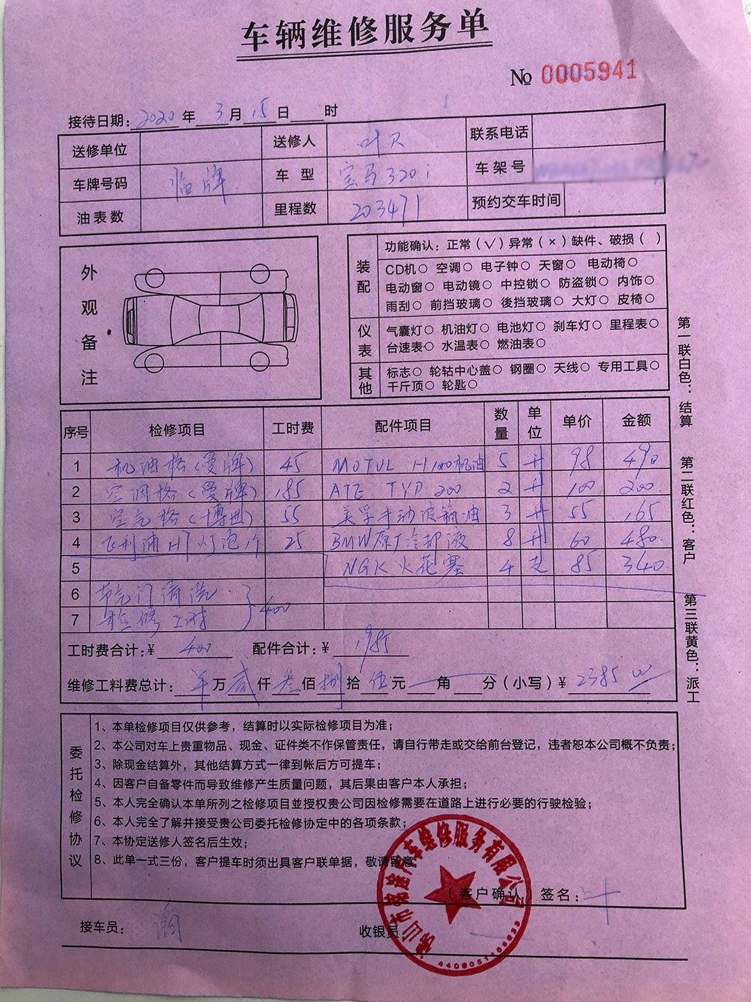 整个保养下来耗费了几个小时,配件费用花费了1985元,工时费由于是相熟的店只收了400元,全部价格2385元,比我预计的2500~3000元要省出一部分,价格也还算是合理吧。