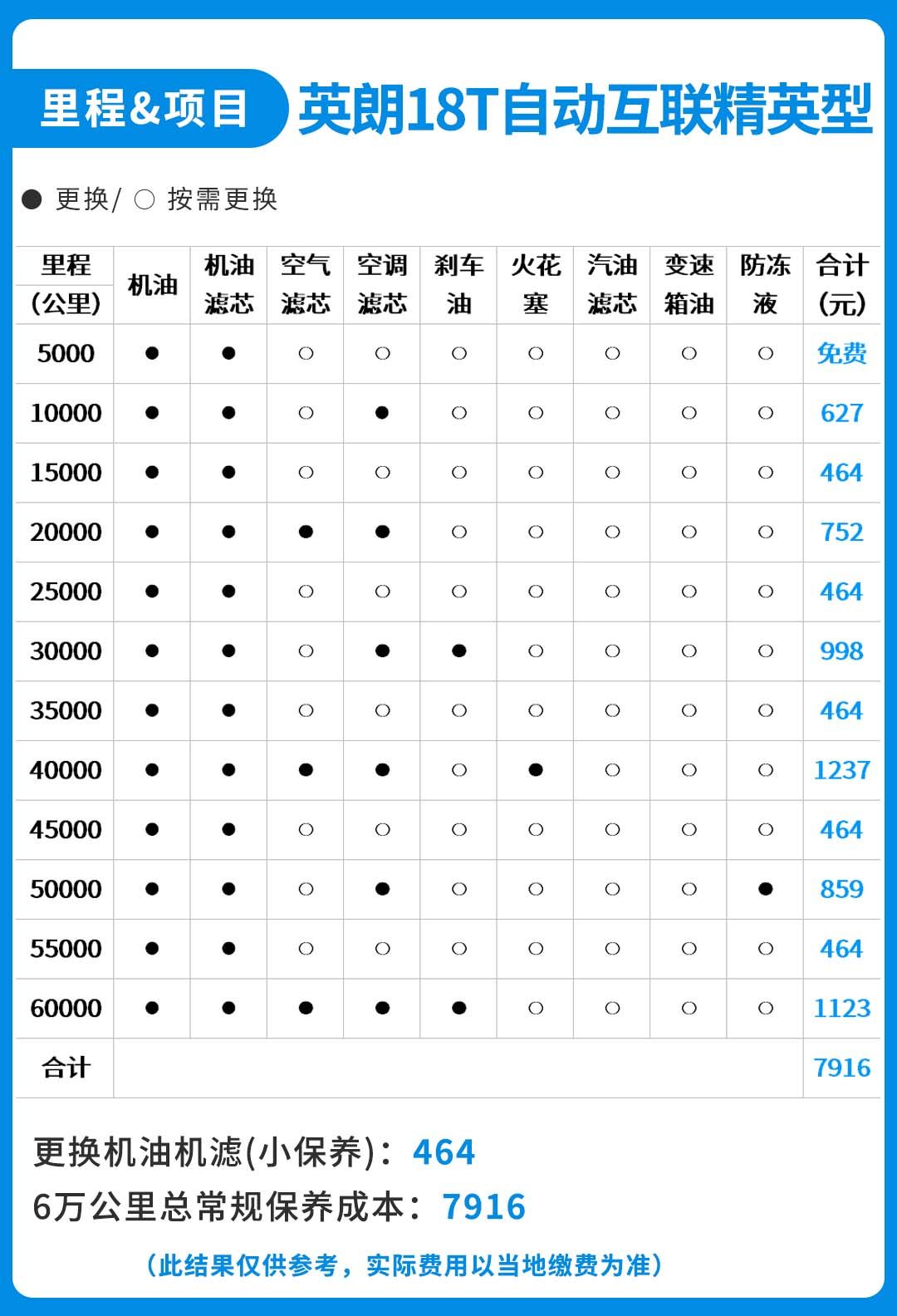 根据厂家建议,英朗的保养周期为5000公里,其中第一次保养免费。小保的费用大概464元,大保的费用大概1237元。按照3年6万公里的行驶里程来算,三年的总保养费用约为7916元,每年平均花费约2638元,每月平均花费约220元。