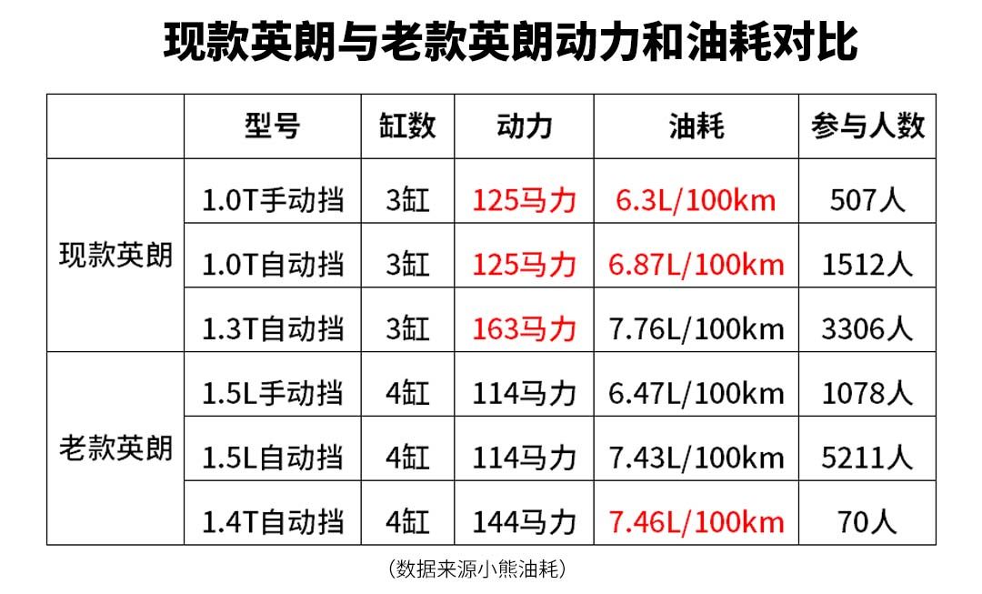 为了让大家有更直观的感受,我们找到了搭载1.5L、1.4T四缸机的老款英朗作对比,在小熊油耗上,1.5L手动挡英朗的平均油耗为6.47L/100km(1078人平均值),1.5L自动挡英朗的平均油耗为7.43L/100km(5211人平均值),1.4T自动挡英朗的平均油耗为7.46L/100km(70人平均值)。可以看出,替代老款1.5L发动机的1.0T发动机,无论手动挡还是自动挡车型,相比老款都更加省油;而替代1.4T发动机的1.3T,则比老款车型更耗油。