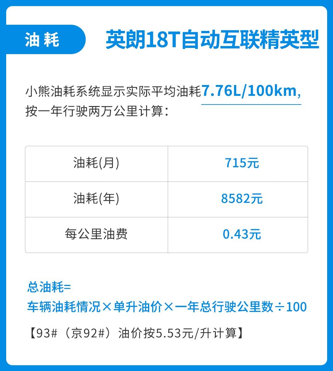 按照目前广东地区92号汽油5.33元/升的价格来算,英朗18T 自动互联精英型一年行驶2万公里的总油费约为8582元,每月平均花费约715元。