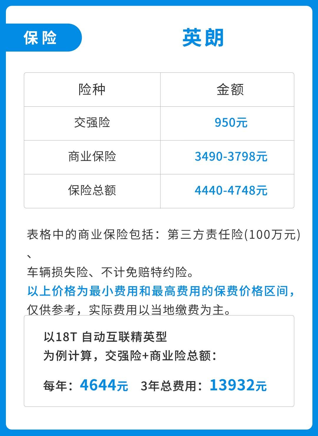 商业险按照第三方责任险、车损险、不计免赔特约险来计算,以售价为13.59万的英朗18T 自动互联精英型为例,一年的保险费用约为4644元,每月平均387元。