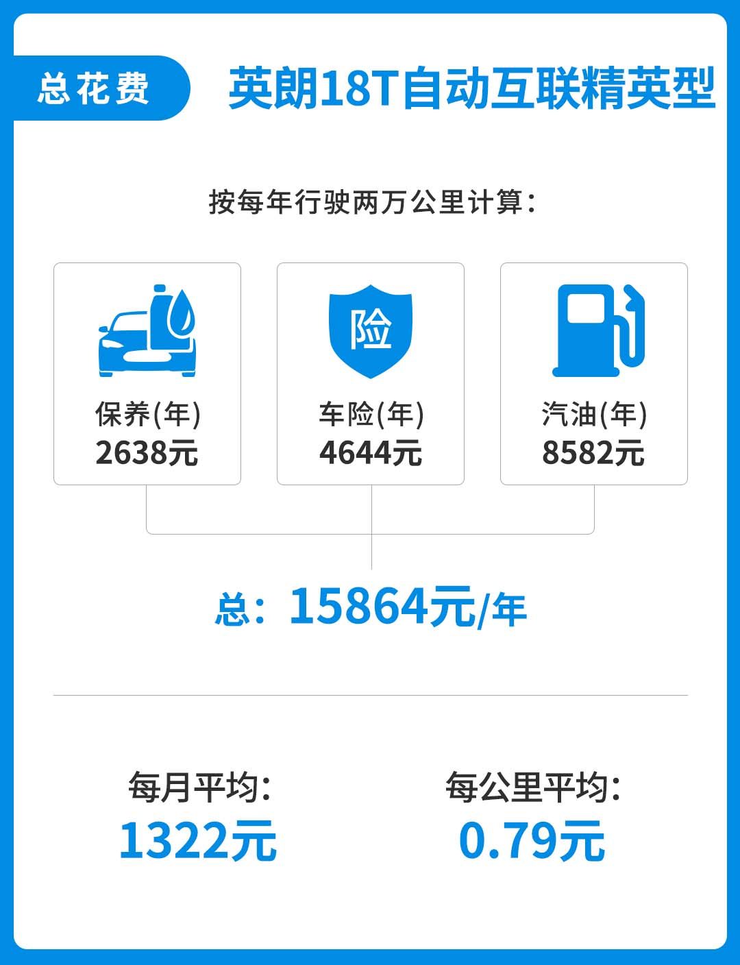 综上来看,按1年行驶2万公里来计算,英朗18T 自动互联精英型一年的保养费、保险和油费分别为2638元、4644元和8582元,一年的养车总费用大概15864元,每月平均约为1322元,每公里平均约0.79元。之前计算过的卡罗拉1.2T自动挡车型养车成本大概1200元/月,朗逸1.5L自动挡车型大概为1300元/月,所以英朗的养车费用在同级车型中处于中游水准。