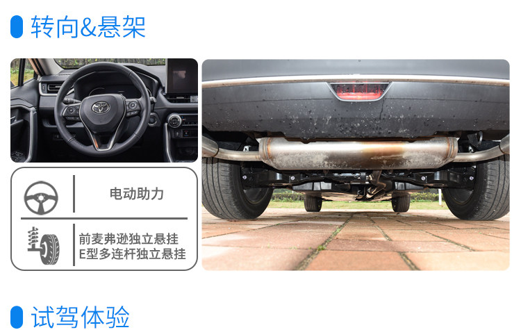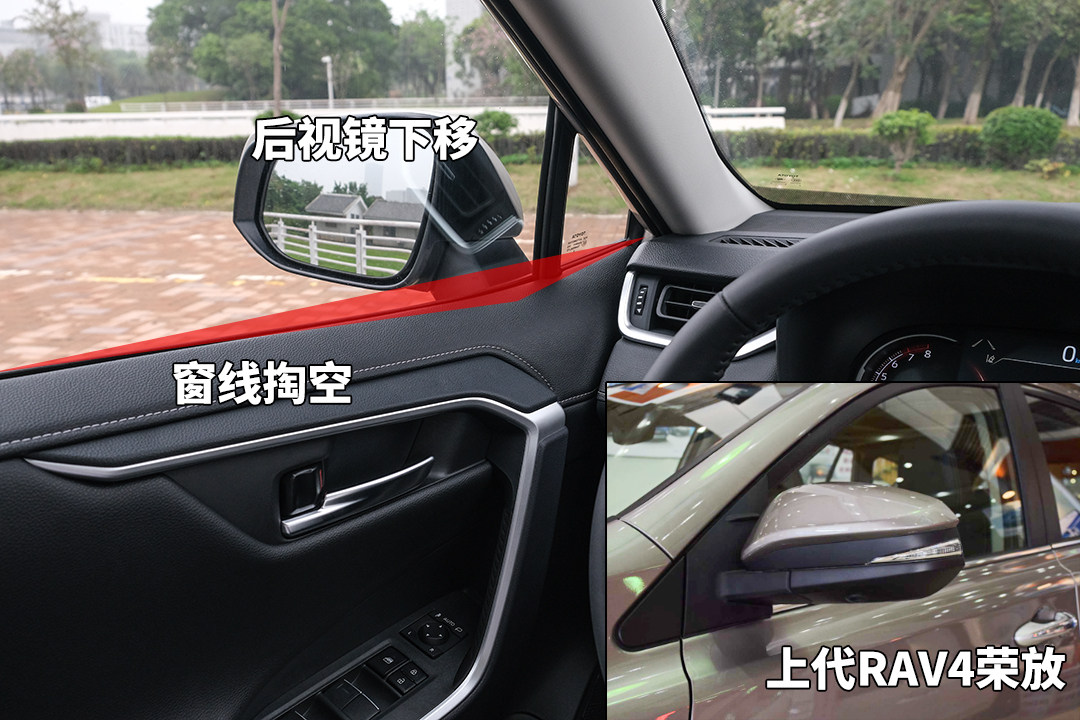 另一个差异是轮圈的样式和尺寸,威兰达的轮圈样式更具豪华精致质感,也是有点向雷克萨斯靠拢;尺寸方面威兰达的18英寸起步,本次测试车型轮圈规格为235/55 R 19;而RAV4荣放的轮圈偏运动也行,以5辐式造型为主,尺寸18英寸起步。