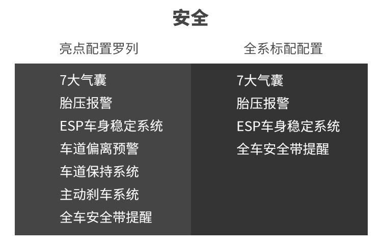 TNGA理念下的丰田车型安全配置都很高,7大气囊/ESP/胎压报警全系标配,威兰达除了最低配车型,其余车型都配备主动刹车、车道偏离预警和车道保持。