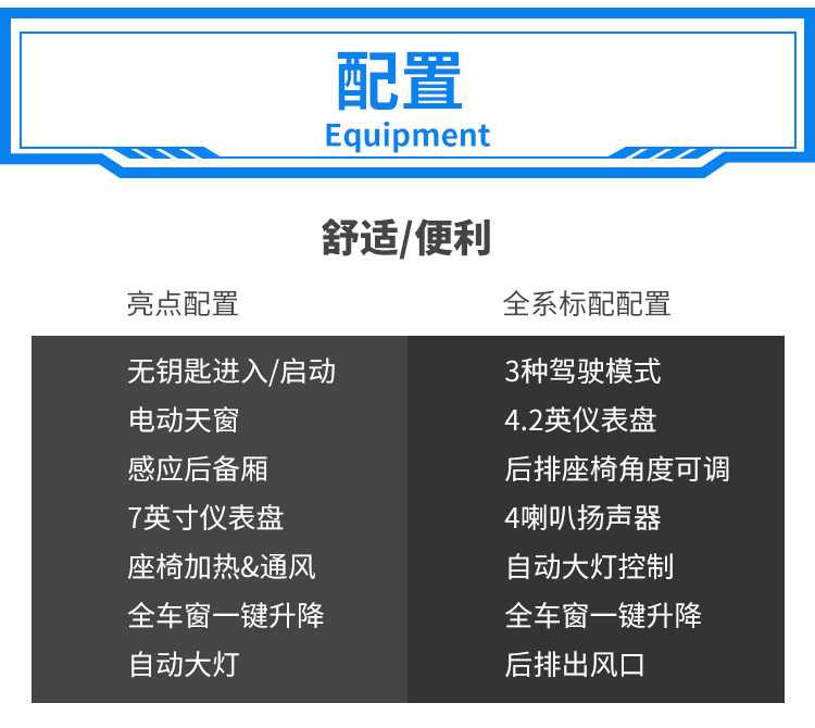 由于是2.0L的顶配,舒适配置比较到位,天窗最低配以外都有配备,入门配置还是比较可观的;后备厢配备感应开启,前排配备加热和通风功能,前后排都有USB口,属同级别中上游水平。