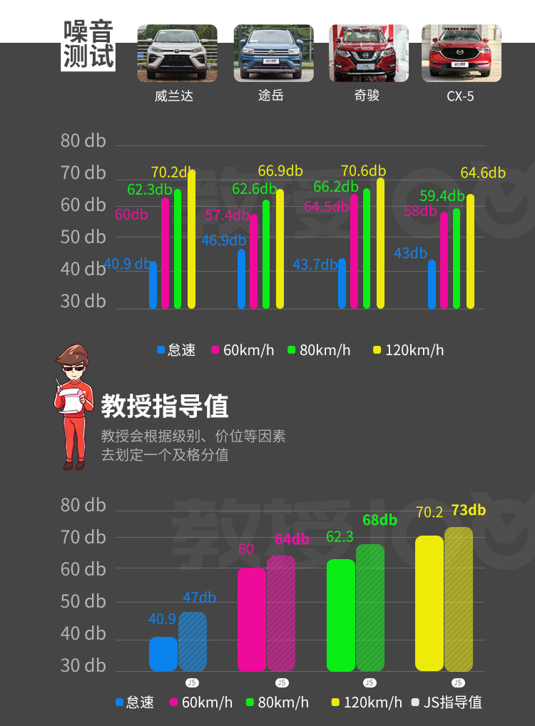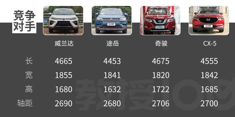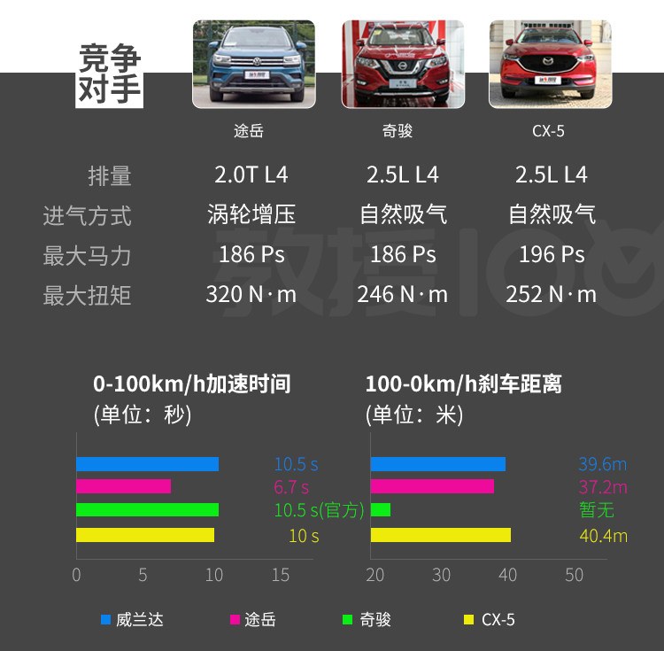 对比的车型都是同价位的高配车型,其中途岳由于用的是2.0T发动机,动力的强悍性能毋庸置疑;而威兰达对比奇骏和CX-5的自吸动力基本差不多,而且威兰达的发动机才只有2.0L,动力表现已然足够。