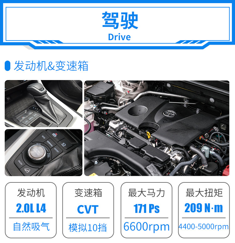 好开不仅仅体现在视野,自吸+CVT变速箱的配合更是无可挑剔,绵密平顺,非常好上手,而且有经济/普通/运动模式可调节,运动模式游走在城市中毫无压力,CVT变速箱的转速拔升是可以的,能迅速拉到3-4千转,只是自吸发动机动力不算特别强悍。