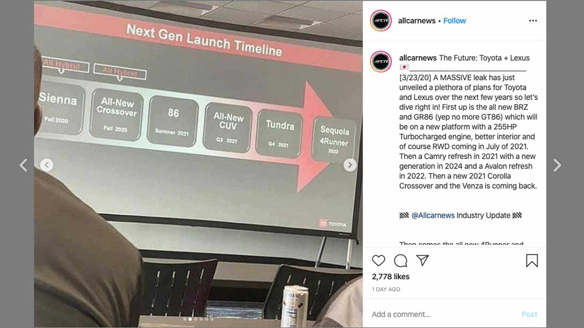 日前根据海外媒体的报道,一份关于丰田未来新车规划的图片从一次海外经销商会议中流出,图片中带来了丰田未来产品几个颇受关注的信息点。按照其新车规划,全新的丰田86将会在2021年夏天和大家见面,此前就有消息称,丰田将计划在2021年推出一款配备2.4L水平对置涡轮发动机的全新跑车。此外,被看作引入国内市场重点车型的全新一代塞纳将会在年内亮相,从图片中的信息来看,该车在未来仅会推出混合动力版本。同在今年还有另外一款全新的跨界车型将推出,以当下对丰田所掌握的信息来看,教授有理由相信这是重新归来的Venza威飒。这些新车,每一辆都颇受海内外消费者关注,对于丰田其产品线的更新进程而言也是极为重要。