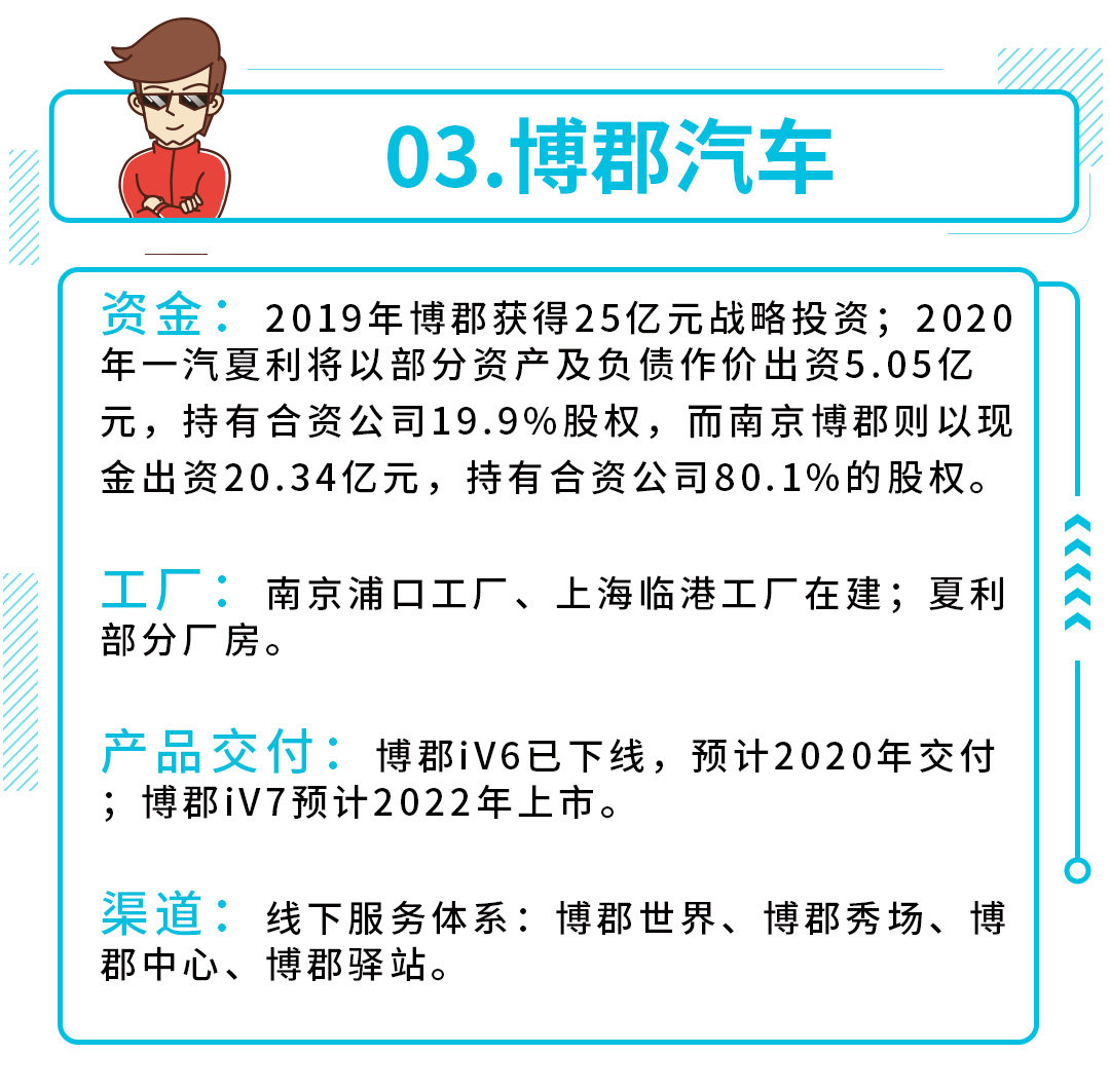 2020年3月,天津一汽夏利更名为“天津博郡汽车有限公司”,意味着博郡正式获得造车资质。而且博郡iV6和iV7已经亮相,也就是博郡已经不属于PPT造车的范畴了。不过目前博郡的资金仍有比较大的缺口,后续产品的研发与落地才是博郡活下去的根基。