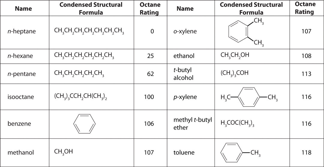 在一般汽油机中,最理想的情况当然是压缩到最后,由火花塞点火,而不是跟柴油一样压燃燃烧,所以辛烷值高是一件好事。我们的标号一般是0-100,当然也可以拥有100以上的标号,例如赛车用的汽油就是100标号以上的,一般来说我们讨论的是0-100范围,即庚烷代表标号为0,辛烷代表标号为100,这两个都是碳氢化合物,庚烷是C7H16,辛烷是C8H18,所以,庚烷为0,辛烷为100,意味着庚烷更容易被压燃,辛烷不容易被压燃。