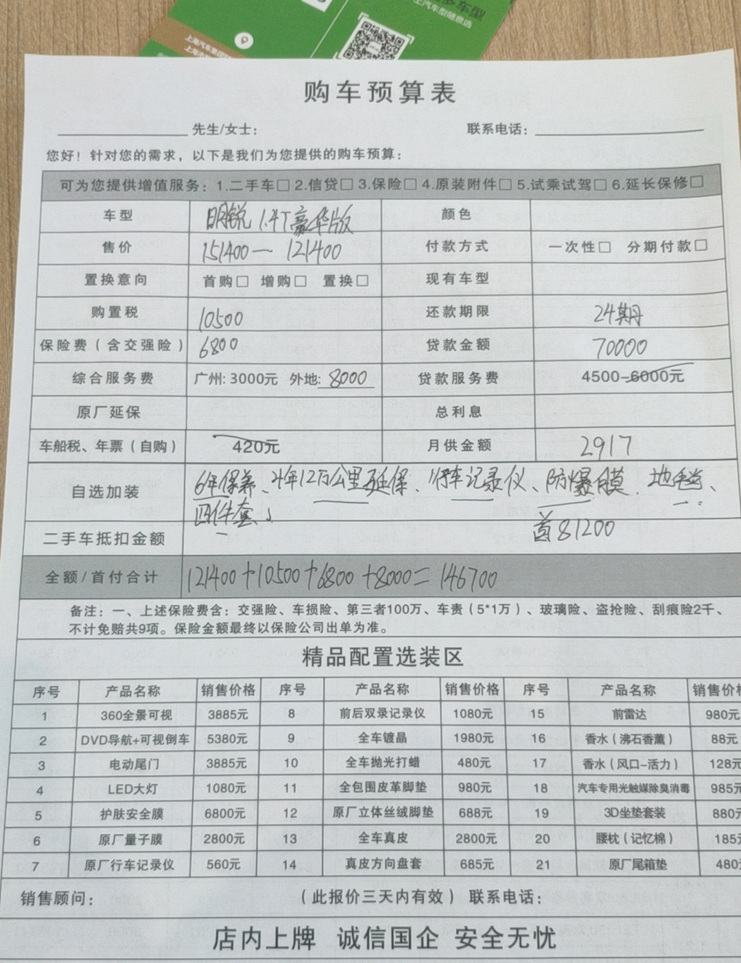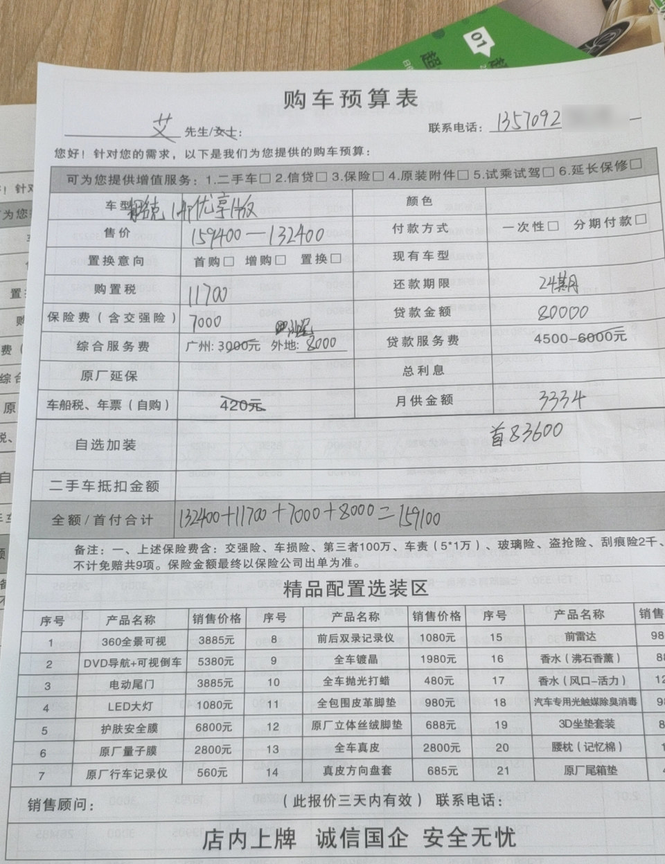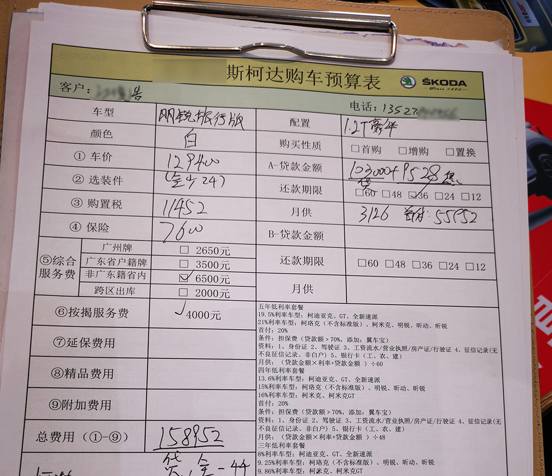 根据销售提供的详细预算单,可以将购买方式分为全款、两年免息贷款以及5年带息贷款三种: