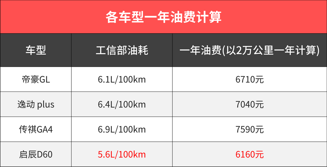 得益于日产三大件,启辰D60在一众国产A级轿车中拥有很明显的经济性优势。如果按照工信部油耗、一年2万公里使用里程,油价5.5元/L来计算,那么启辰D60一年的油费是6160元/年,传祺GA4一年的油费是7590元/年,一年下来的差距就是1430元。