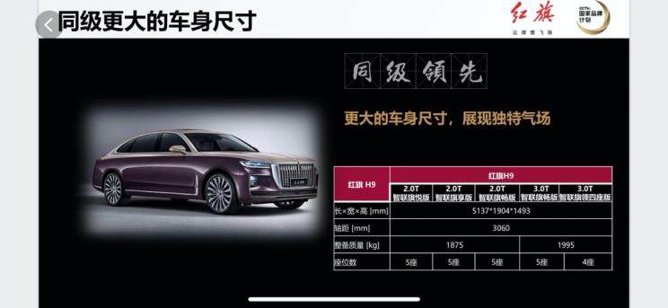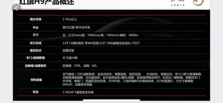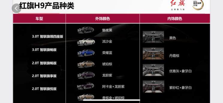 日前就有国内媒体曝光了红旗H9的内部培训资料,从图片中我们能够获得新车的具体配置。新车将提供4款2.0T+48V版本车型和1款3.0L机械增压版本车型,新车计划将于6月正式上市。5款车型里,分别为2.0T智联旗悦版、2,0T智联旗享版、2.0T智联旗畅版、3.0T智联旗畅版、3.0T智联旗领四座版。颜色方面,红旗H9提供魅夜黑、流沙金、荣耀蓝、琥珀棕、龙胆紫共5款单色车漆,同时还提供阿卡金+龙胆紫和香槟金+琥珀棕2款双色车漆可选,内饰方面则提供4种配色。配置方面,该消息暂时没有透露具体车型的配置信息,而从特色装备一栏可以看出,红旗H9配备了像空气悬架+CDC减振系统、高级巡航系统、主动安全系统、全车座椅加热/通风/按摩、后排座椅电动调节、电吸门、OTA升级、BOSE 12扬声器音响系统、253色氛围灯、大尺寸HUD抬头显示器等特色配置。动力方面,2.0T发动机最大功率252马力,峰值扭矩380牛·米;3.0L机械增压发动机,最大功率272马力,峰值扭矩400牛·米,传动方面均匹配7速DCT双离合变速箱,新车的具体实力让教授非常期待。