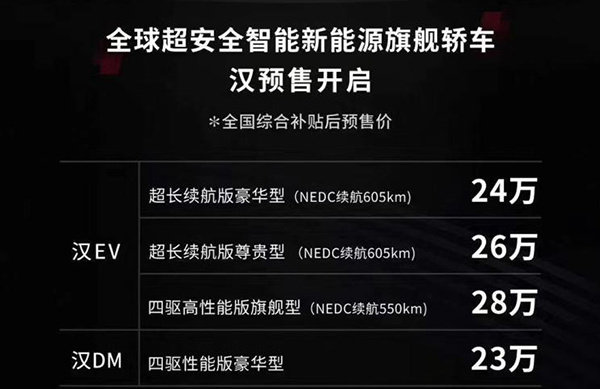 日前,备受期待的比亚迪汉正式开启预售,新车本次共推出四款车型,补贴后预售价格区间在23.00-28.00万元。据此前消息了解,新车有望在6月正式上市。汉EV的超长续航版本(中低配车型)配备最大功率163kW的前电机,峰值扭矩为330牛·米,NEDC续航里程为605km。四驱高性能版车型(高配车型),其在前电机的基础上多增添了一台最大功率为200kW且峰值扭矩为350牛·米的后电机,NEDC续航里程为550km。以目前所推出的车型来看,汉DM为顶配版本,该车配备了一台最大功率为141kW的2.0T发动机和最大功率为180kW、峰值扭矩330牛·米的电机,纯电续航里程暂时未知。较有亮点的是,未来上市的比亚迪汉将搭载备受关注的刀片电池。目前购车预定,比亚迪还有相应的多重购车优惠政策。