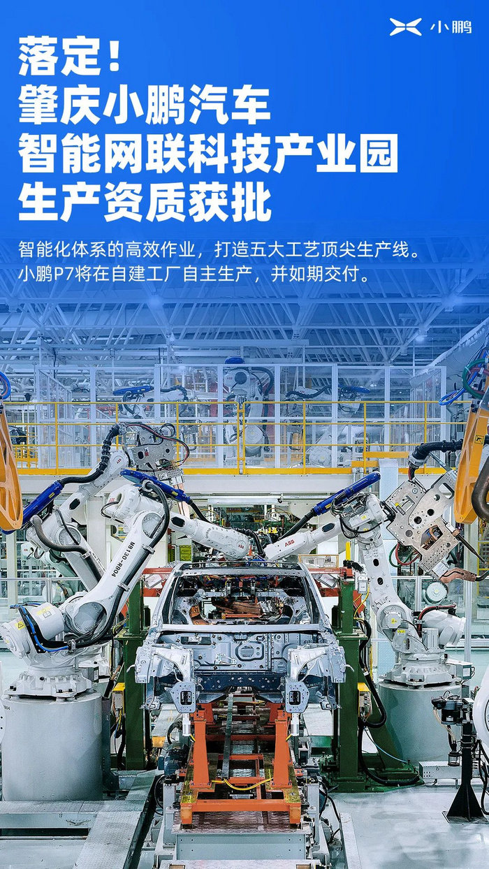 5月19日小鹏汽车官方宣布,位于肇庆的小鹏汽车智能网联科技产业园正式获得生产资质。该工厂总投资额40亿,其年产量能达到10万辆,已接近交付期限的小鹏P7将在该工厂进行生产。2019年9月,该工厂生产车间完成封顶并开始进行预生产及设备调试,目前已有小批量试制车从该工厂下线。小鹏汽车能越过发改委,直接获得由工信部颁发的生产资质,原因是其早前收购了广东福迪汽车有限公司。在国内新势力造车的企业里,理想、威马同样通过收购的方式获得了生产资质。