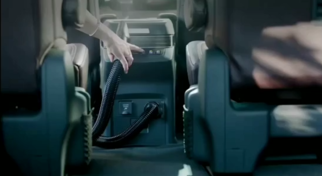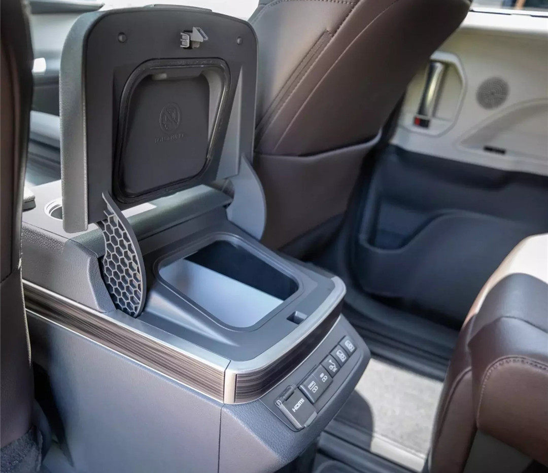 前排中央扶手后方还有可供第二排乘客打开的储物格,从曝光的图片看,可能拥有冷藏功能,下方还拥有“丧心病狂”的8个外接电源口(仅是扶手后方数量,全车数量未知)。另外部分车型可能自带车载吸尘器,接通前排扶手后方电源即可使用。这些配置,毫无疑问就是家用利器。