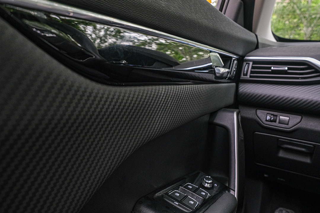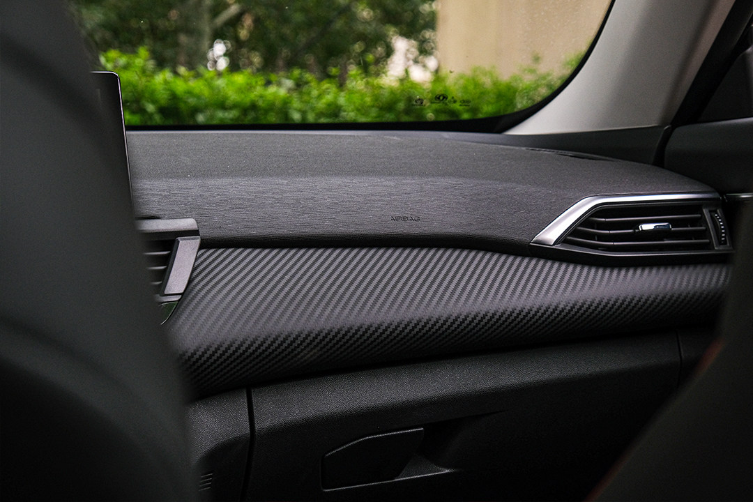 不仅是驾控,进入车内,甚至还能发现标致的影子,而且质感有惊喜。整体布局跟奕炫保持一致,前排内饰用料采用大面积的软质包裹,中控中间部分是仿碳纤的软质包裹,上方则是软质搪塑, 这种似曾相识的用料,在标致的车系能发现不少共同之处。