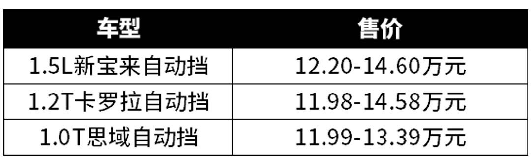 另外因为1.5L宝来低配的几款车型为手动挡,而1.0T思域和1.2T卡罗拉均为自动挡车型,所以新宝来11.1万元的起步价还有一定水分,我们以各自自动挡车型为例,1.5L宝来自动挡的起步价为12.20万元,比思域/卡罗拉自动挡贵了约2000元。