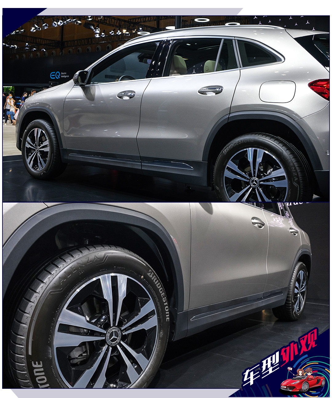 所以从侧面看去,你可以看到全新GLA的前后悬是非常短的,尤其是后悬,车轮非常接近车尾,四轮更接近车身四角,也是车内空间最大化的设定。另外车窗的窗线和轮廓都很修长,保留了现款GLA修长姿态,为车身侧面增加一点运动感。