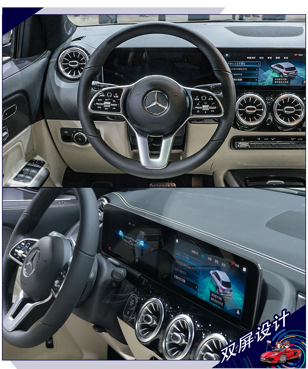 方向盘造型也是同样设计,颜值和尺寸手感都很到位;仪表盘造型有多种模式,包括经典/运动/前卫/柔和,跟GLB如出一辙。