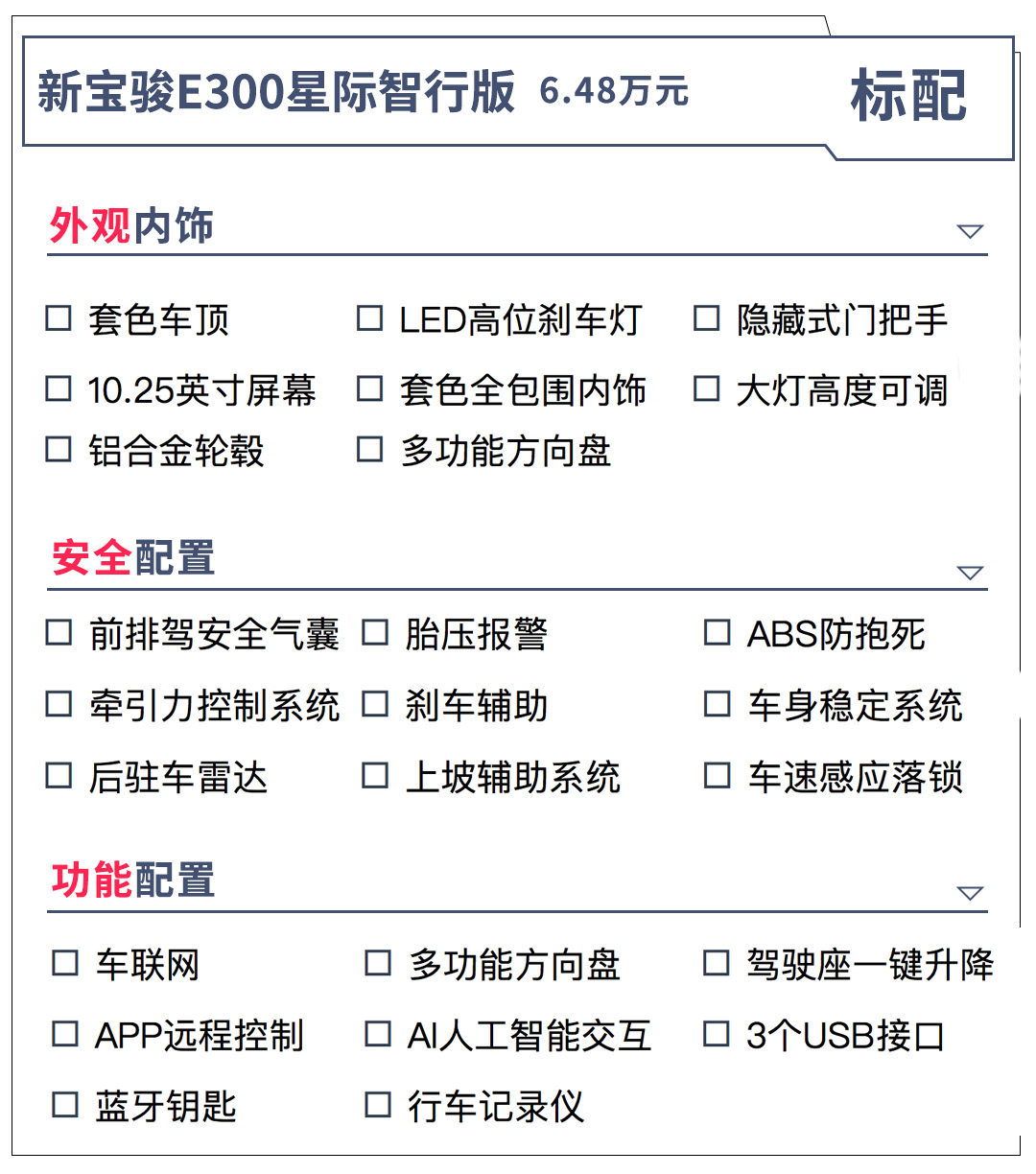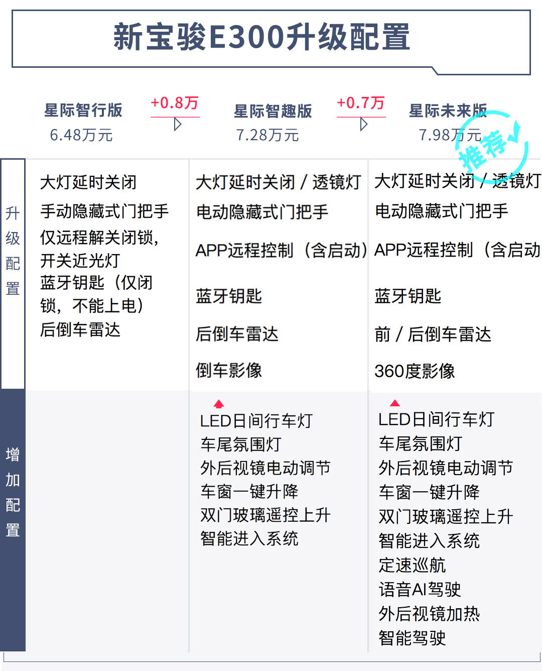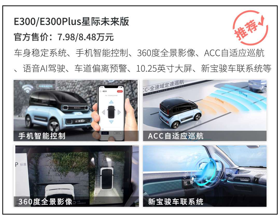 除了版本之外,估计还有人在新宝骏E300和E300Plus之间徘徊,和E300一样,E300Plus同样分为星际智行版、星际智趣版、星际未来版,而且配置与E300基本保持一致。