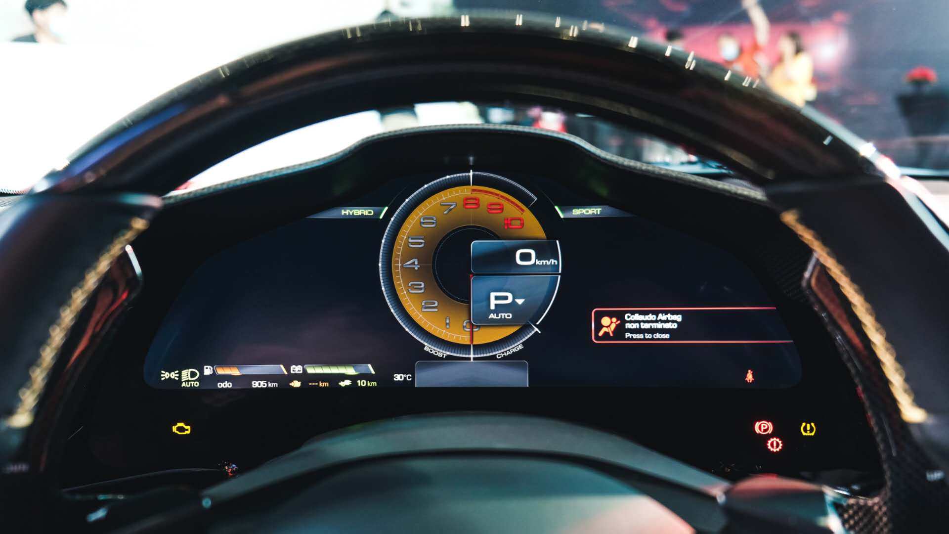 除此之外,还有全数字仪表盘,方向盘新增触控按键,电动助力方向盘,和法拉利工程师的精益求精:为了减重,双离合变速箱上的倒挡齿轮被拆掉了,靠前轮两个电机反推车子来实现倒车。