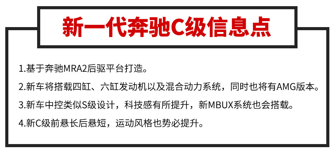 全新奔驰C级车身侧面的轮廓和现款车型相比变化并不大,它的C柱采用了一个家族化的造型设计也比较眼熟,甚至它的轮毂造型跟现款一致。不过仔细看就会发现前悬长后悬短,看起来运动范十足,其实这是MRA2后驱平台的功劳。