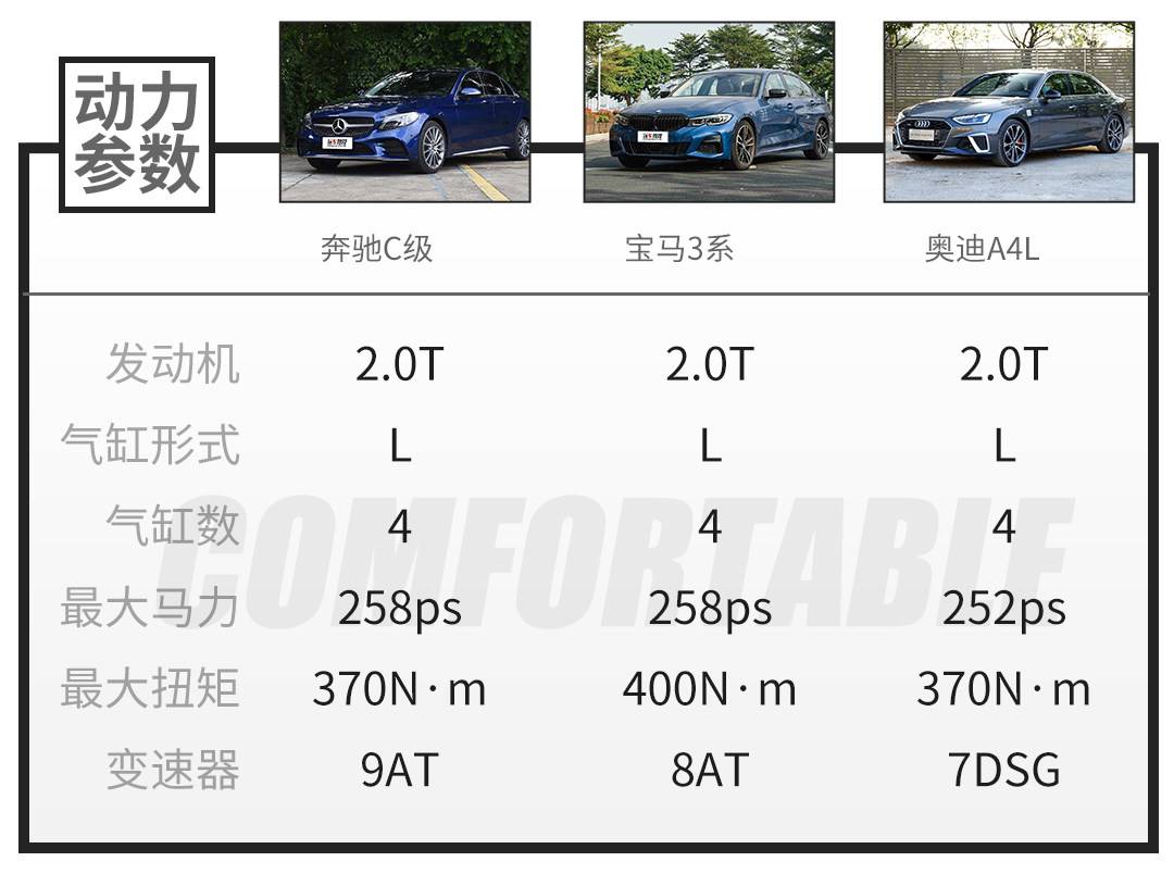 为什么不说动力系统,因为三者的动力在参数上接近,而且驾驶的风格不一样,3系偏操控、C级优雅舒适、A4L均衡,很难说谁更优秀,只能根据你自己的喜好选择。