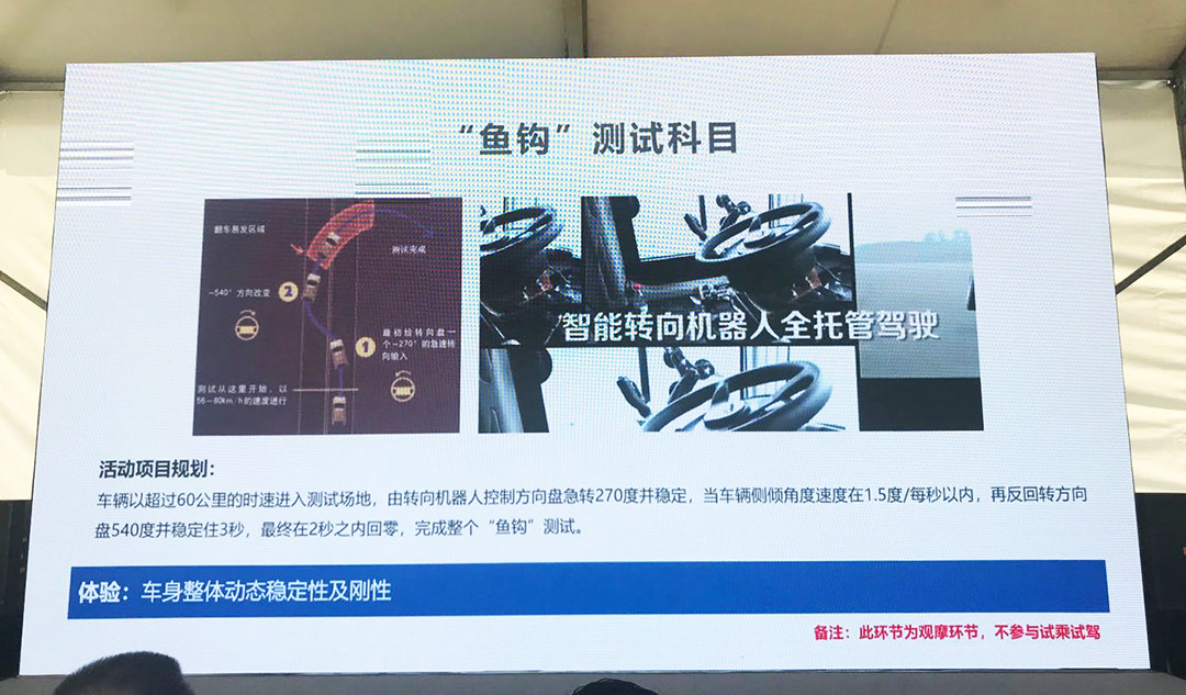 综合极限挑战的项目主要是鱼钩测试,因为测试中车辆行驶路线的形状和鱼钩相似而得名。翻车事故虽然在交通事故中占比不高,但是依然需要被高度重视,而SUV车型要比轿车或跑车更容易发生翻车事故,鱼钩测试实际上就是一个高速碰撞避免试验。