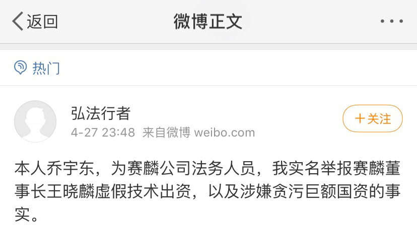 随后关于赛麟汽车的话题不断升级,而在这时另一事件就把赛麟汽车的问题推向至高点。今年4月份,赛麟汽车前法务员工乔宇东在微博实名举报赛麟汽车董事长王晓麟,其表示“王晓麟虚假技术出资,涉嫌贪污巨额国资”(来自乔宇东微博原文),而涉及的金额高达数十亿元。
