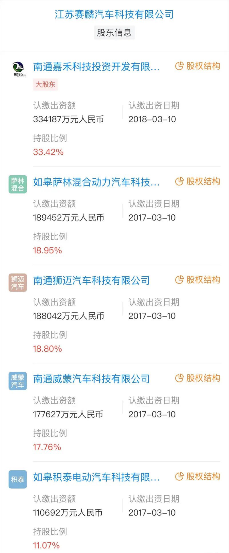 在大致了解赛麟汽车的由来后,我们继续探讨该公司的股权结构。赛麟汽车即江苏赛麟,注册资本为100亿人民币,该公司拥有5家出资方。其中,国资企业南通嘉禾持股34%,以货币认缴方式出资33.4187亿元,这是实打实的给到钱。