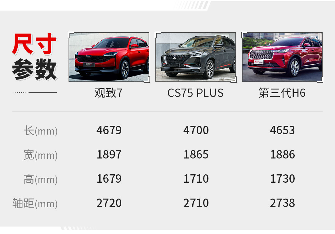 其实观致7的尺寸不小,车长4672mm,轴距2720mm,尺寸跟CS 75 PLUS差不多,事实上它的空间利用率并不低,因为空间都去后面了,后备厢的纵深或者是容积都很可观。