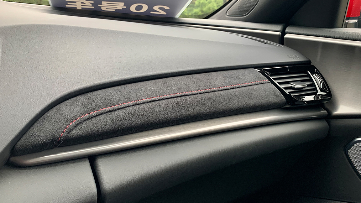 此外方向盘缝线换成红色,下方带有 A-Spec标识,3/9点位置采用了打孔皮质,手感不错;而仪表盘里面的数字、指针也使用了红配色,其次副驾手套箱上方的饰板换上Alcantara材质。