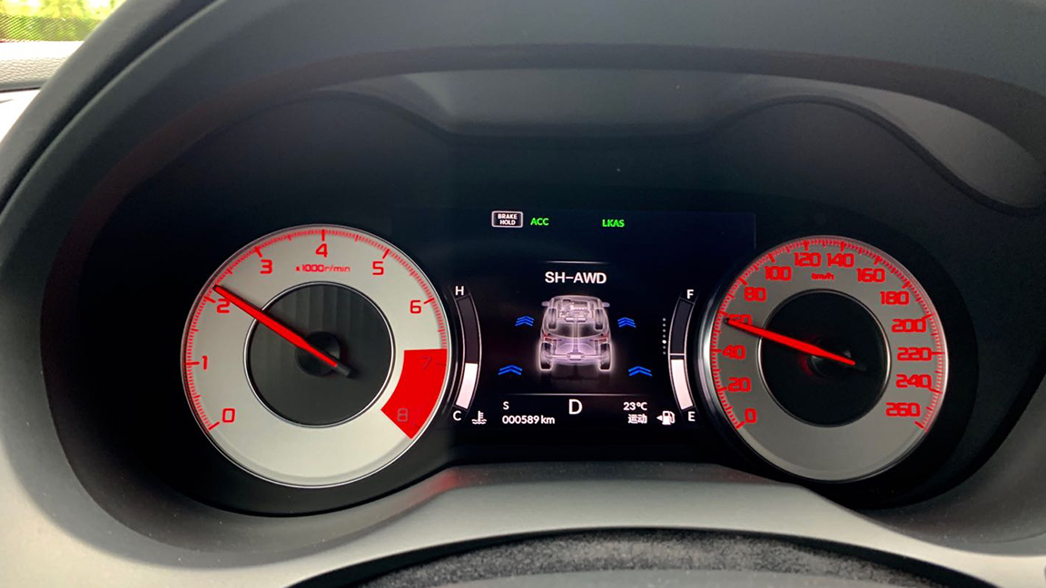 而实时的扭矩分配还会显示在仪表液晶面板里,让驾驶员知道它此时在做什么。举几个例子,在不踩油门的时候它是不会显示分配情况的;假如在一条平直的道路行驶,四个车轮的扭矩将会对等。