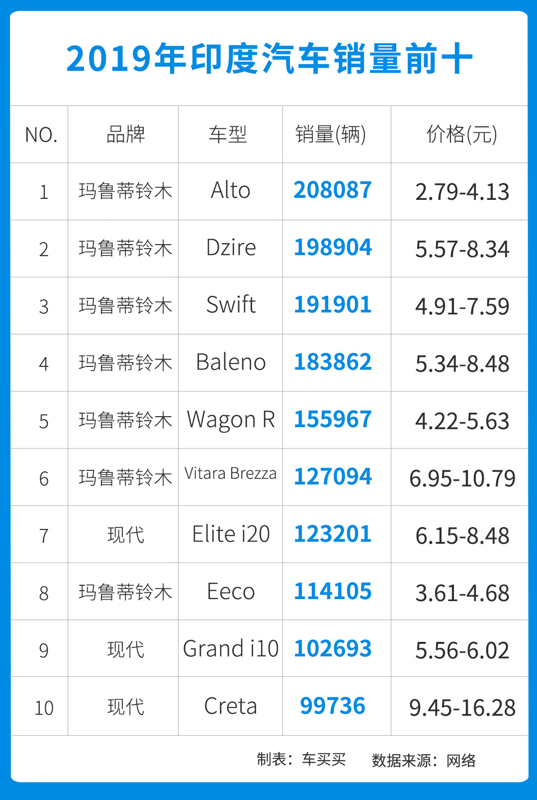 其实不用想,大家也都能猜个八九不离十,印度最畅销的车型基本上都是微型车和小型车,并且价格也是相当便宜。从列表也能看出,前十里最贵的车型顶配价格为16.28万。