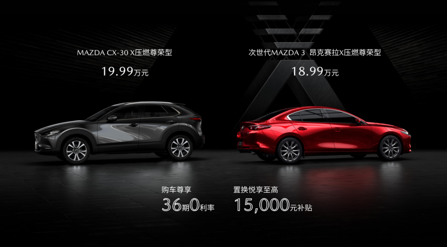 长安马自达CX-30、马自达3 昂克赛拉压燃版车型皆载全新创驰蓝天SKYACTIV-X 2.0L压燃发动机,CX-30压燃版的指导价为19.99万元,昂克赛拉压燃版的指导价为18.99万元。官方宣布,如老车主升级购买,马自达会给予品牌置换补贴(限牌区域15000元,非限牌区域12000元)。