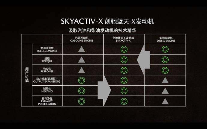 更低的油耗是e-SKYACTIV X创驰蓝天汽油压燃发动机显而易见的特征,据官方数据称,X发动机在NEDC工况下比G发动机燃油经济性提高了30%。追求低油耗并不意味着对动力妥协,e-SKYACTIV X 2.0L发动机的最大马力为180匹,最大扭矩为230牛·米,动力性能也有明显的提升。