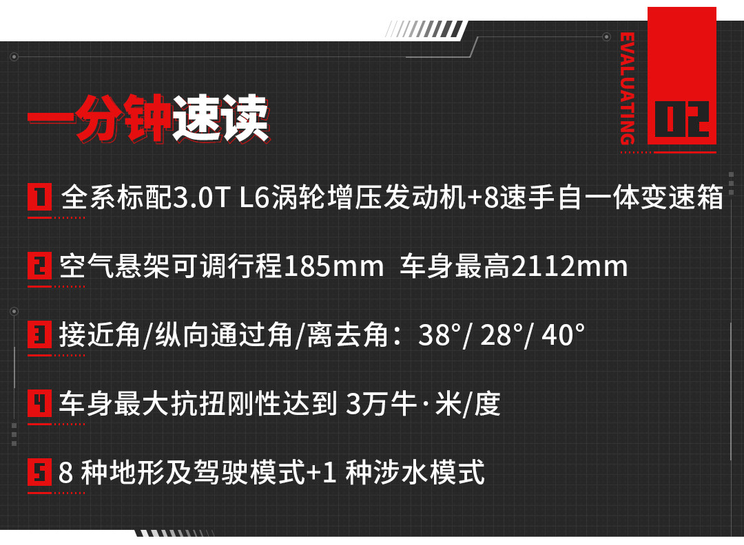 全新卫士的车长达到5018毫米,车宽达到2008毫米,基础车高也达到了1967毫米,而且卫士全系标配空气悬架,空气悬架可调形成高达185毫米,涉水模式下可增高145毫米,车高最高可达2112毫米,加上行李架就是2米多,体型气场跟揽胜不相上下。