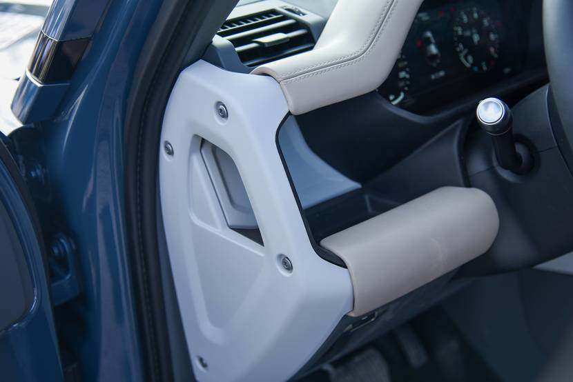 方向盘中间的结构采用镁合金材料,握感就很结实可靠,而且整个仪表台采用双横梁结构,也是作为车身结构的一部分,随处可见裸露在外的铆钉设计更是越野气质的最好呈现,常用的功能按键整齐地排布在挡把右侧,也是实用主义最上。